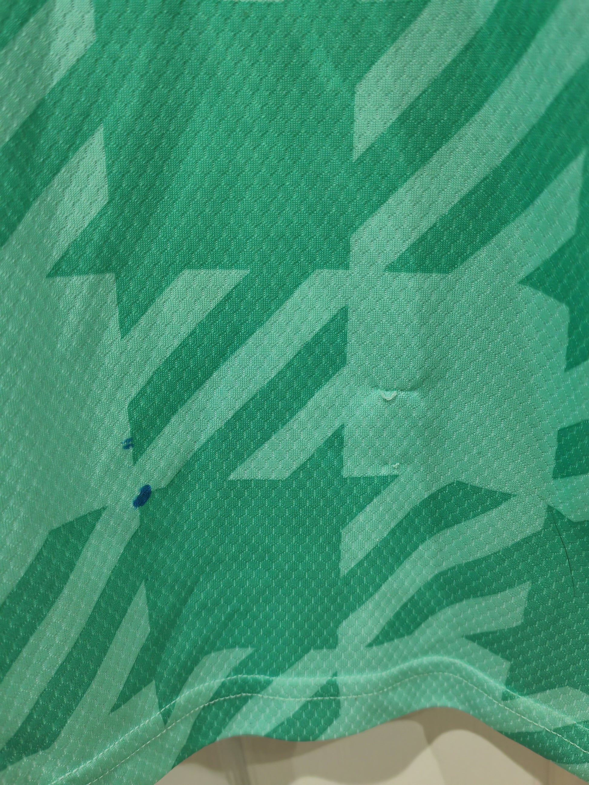 Good condition. There are a few pulls which won't be visible when on mainly towards the bottom of the shirt. There is also a blue mark near the bottom front that may come out in a good wash. It won't show up too much when on.